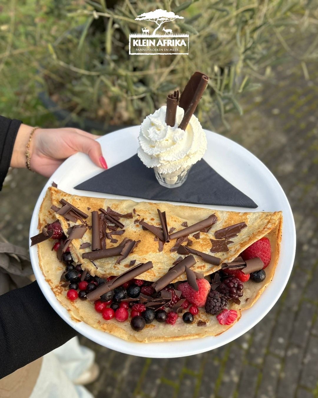 Geniet samen van een heerlijke naturel pannenkoek, belegd met een rood fruit mix, chocolade schaafsel en een toef slagroom!