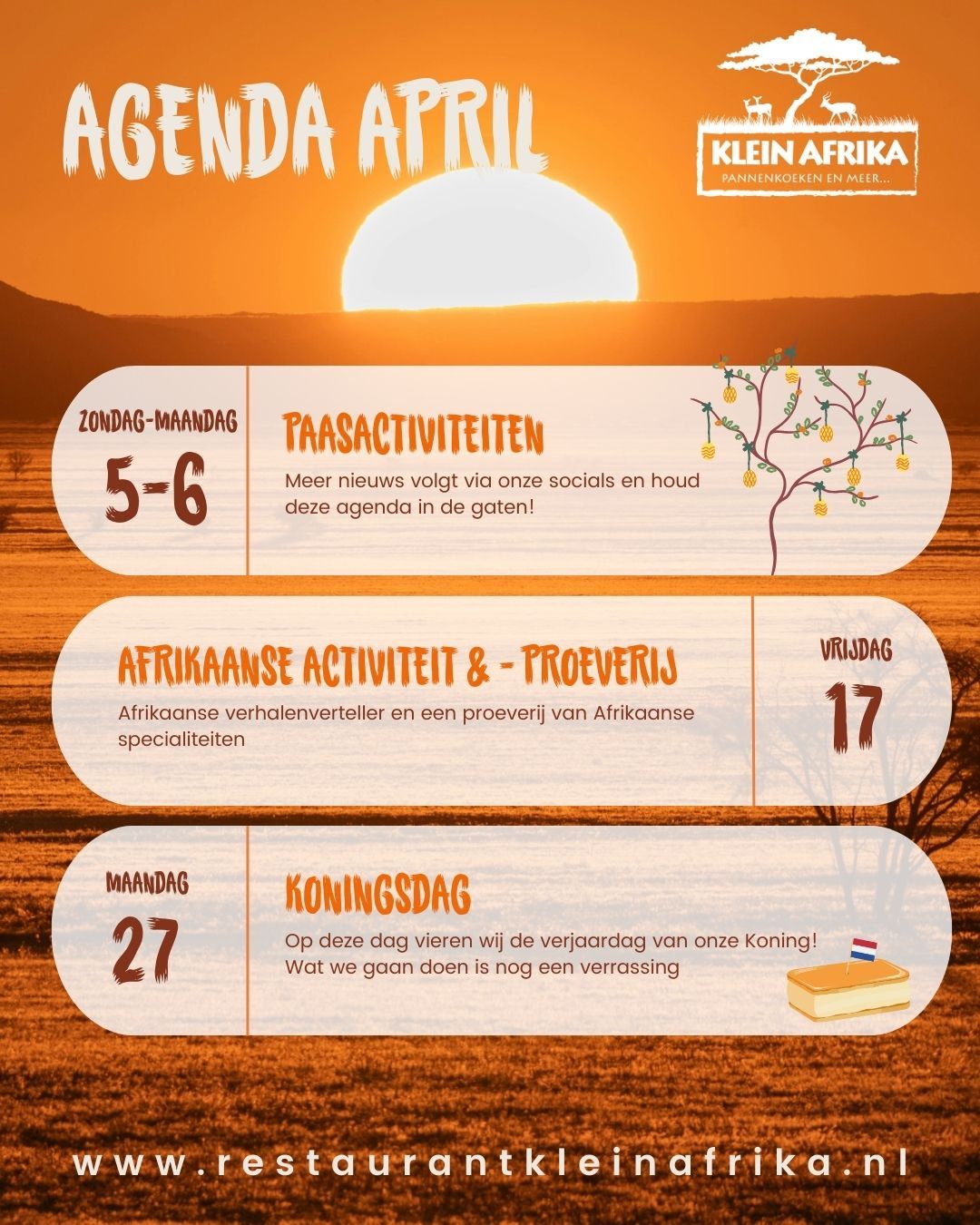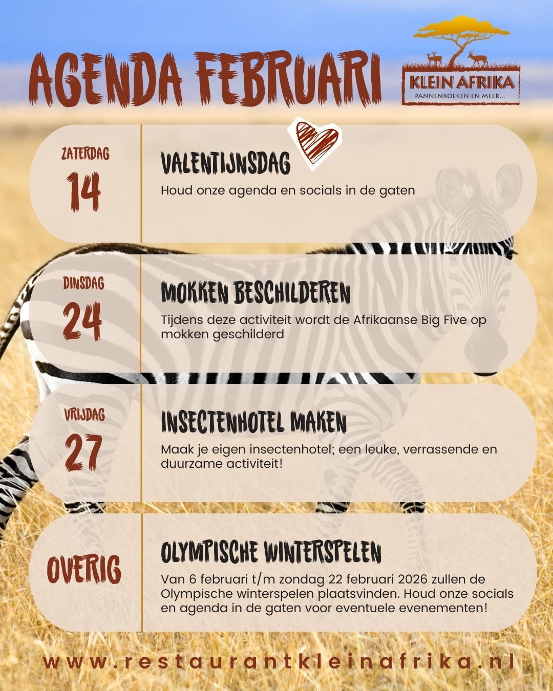 Bij Restaurant Klein Afrika valt er voor jong en oud(er) altijd iets te beleven. Of je nu komt voor een gezellige middag met het gezin of een bijzonder thema-event, hieronder vind je alles wat je niet wilt missen.