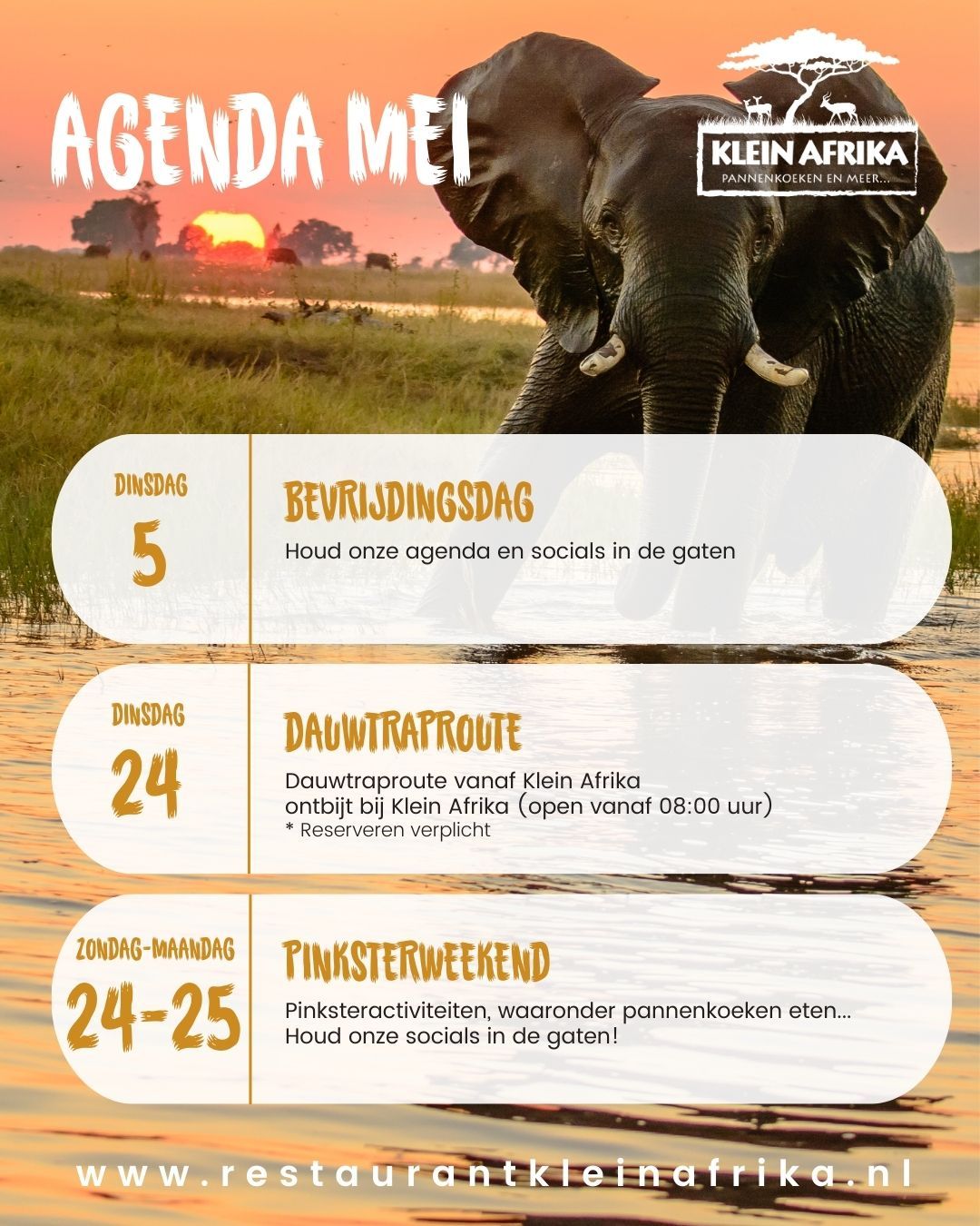 | 14 mei | Dauwtraproute vanaf Klein Afrika Ontbijt bij Klein Afrika vanaf 8:00 uur *reserveren verplicht |